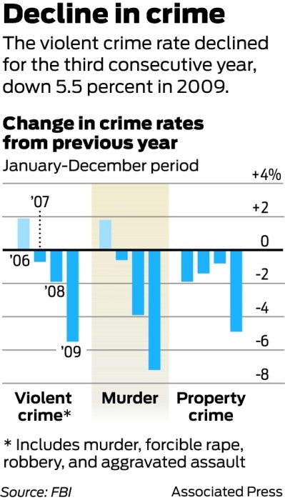 But here’s the thing: that hasn’t happened, and nobody has any clue why. In fact, violent crime has been in decline since it peaked in the early 1990s, and the decline from 2009 to 2010 has been particularly notable. Violent crime decreased 13% between 2009 and 2010. This includes crimes that one would expect to increase dramatically during an economic downturn, such as robbery, burglary, and theft.